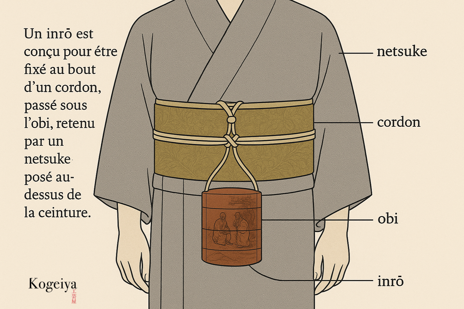 Un inrō est conçu pour être fixé au bout d’un cordon, passé sous l’obi, retenu par un netsuke posé au-dessus de la ceinture.