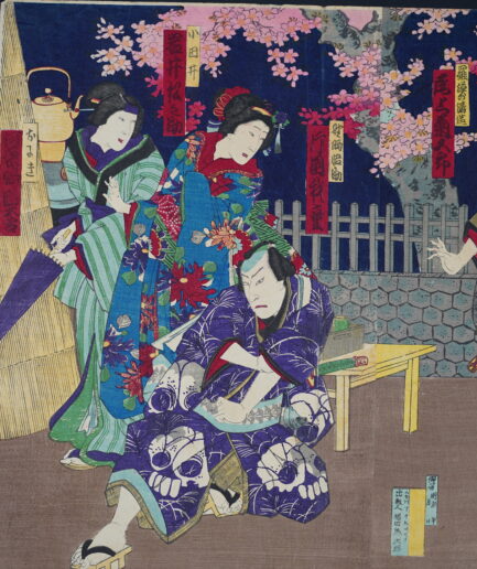 Triptyque d’estampes japonaises de Toyohara Kunichika représentant des acteurs de kabuki – Meiji XIXe s.