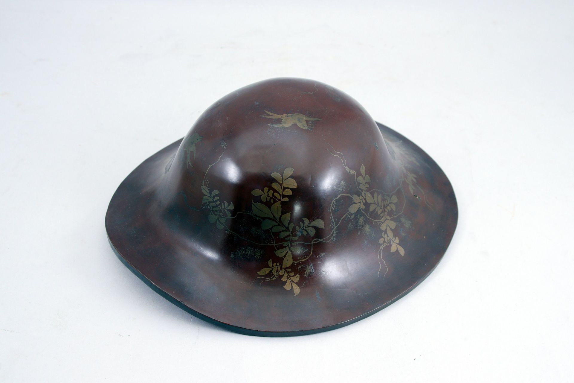 C’est là que le jingasa devient un terrain d’expression : un bel urushi noir, brun ou rouge, une surface « peau d’orange » (ishime-ji), un emblème mon marqué au centre, et l’objet bascule du simple utilitaire vers le bel artefact.