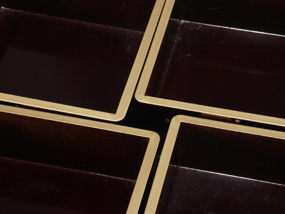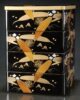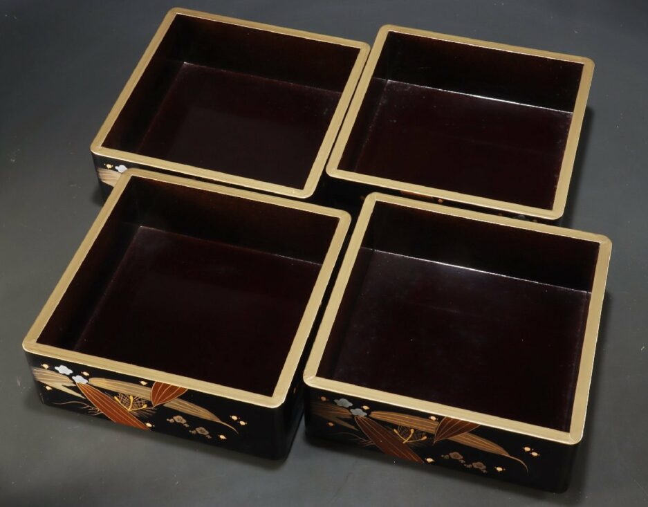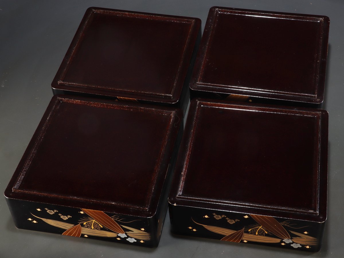 Grande boîte en laque Jūbako à quatre niveaux (34cm de haut) à décor de feuilles de bambou et grues en nashi-ji et maki-e.