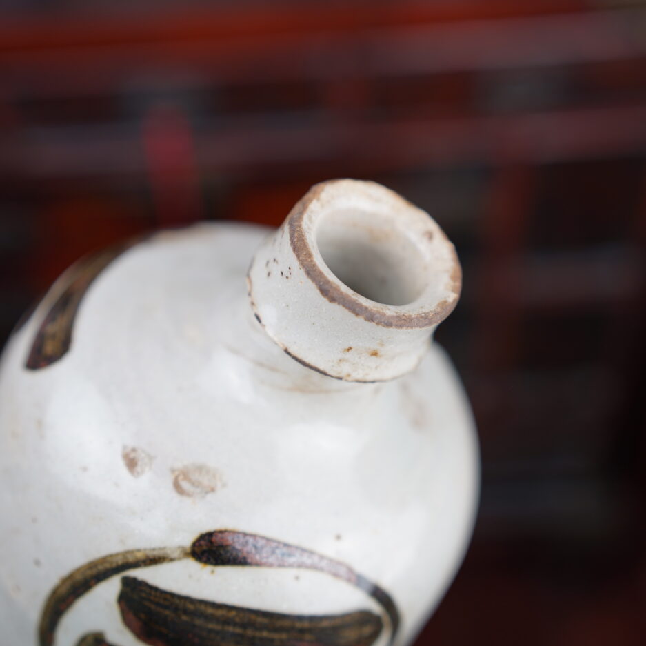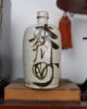 Bouteille à saké tokkuri en grès glaçuré à décor de kanji brun noir.
