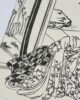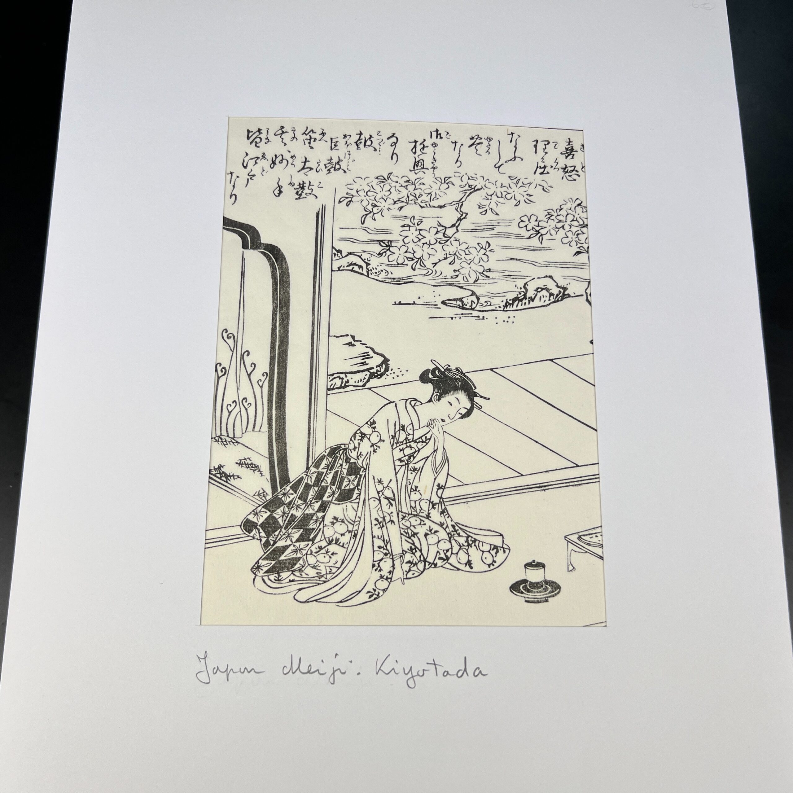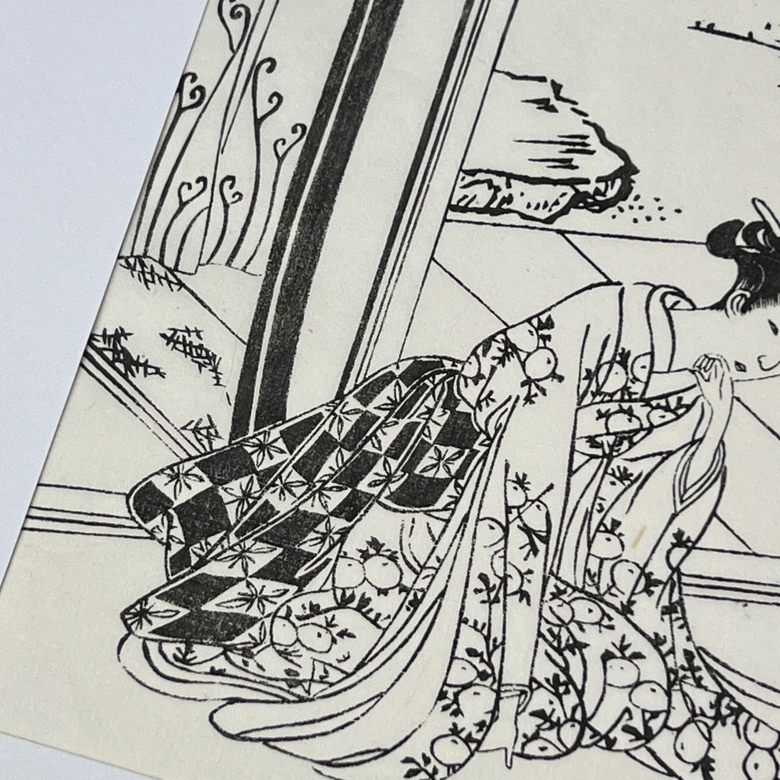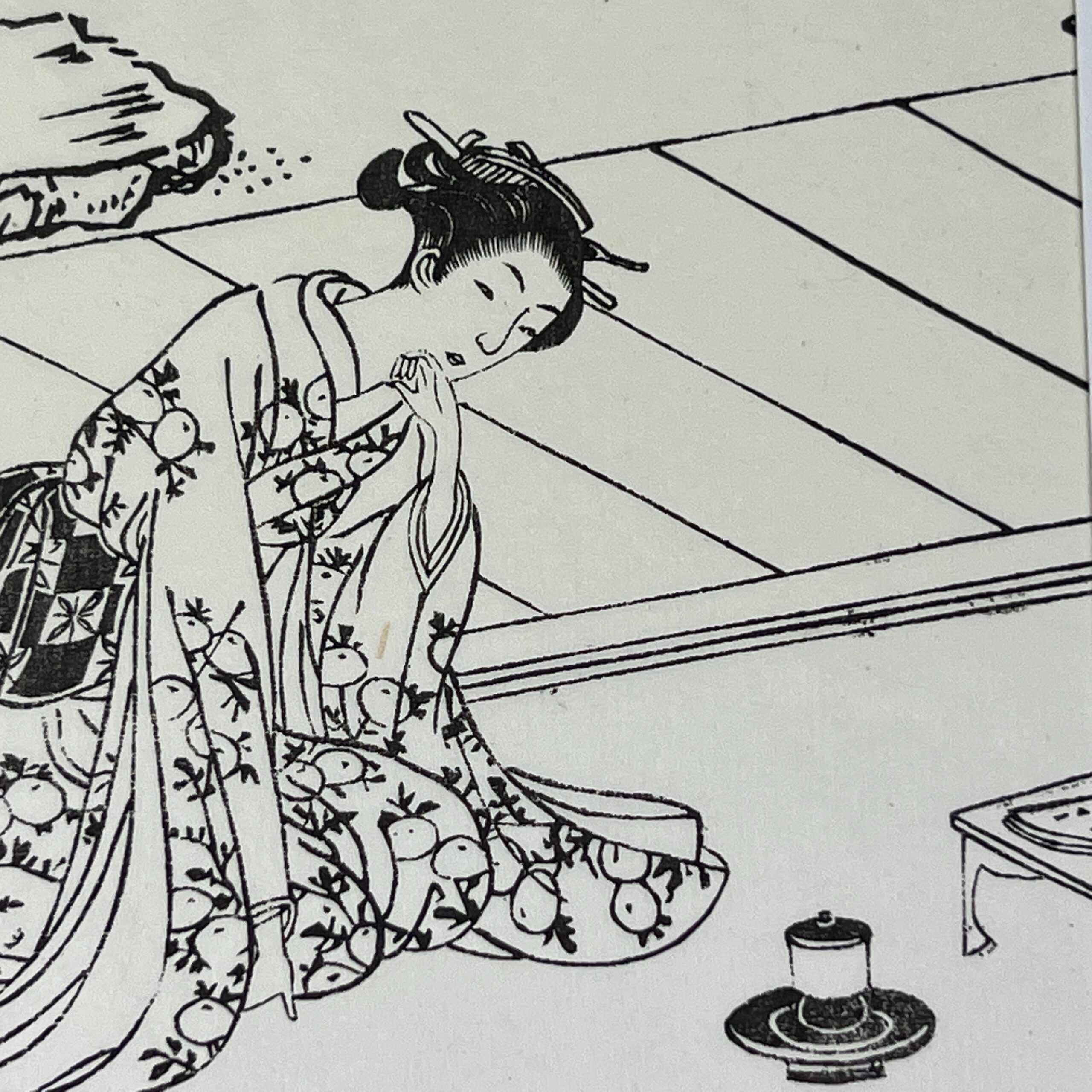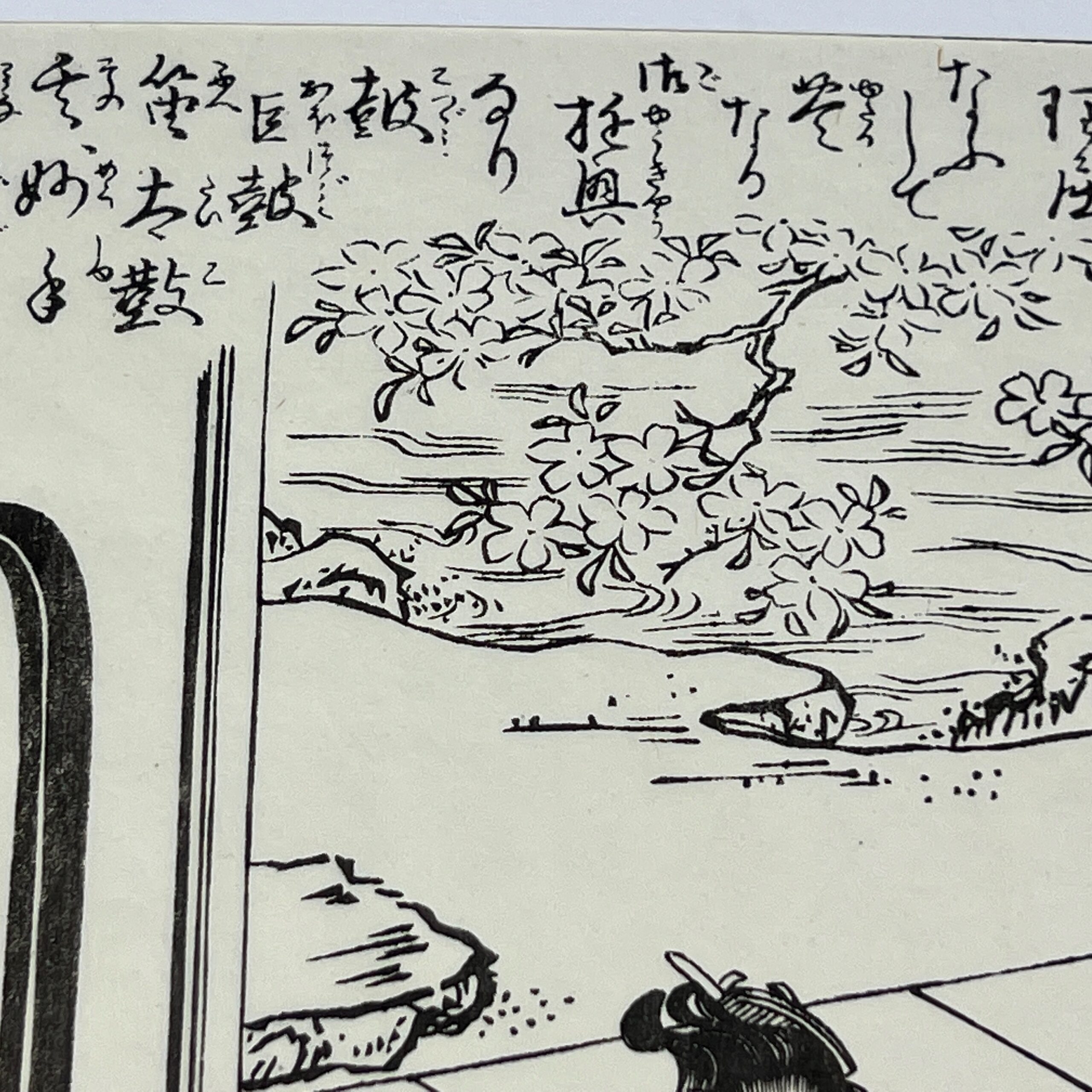 À l’arrière-plan, le regard s’ouvre sur un paysage délicat : rivière paisible, rochers et arbres en fleurs, évoquant une atmosphère printanière et poétique. Un petit objet posé au sol, probablement un brûle-parfum ou encens kōro , qui renforce l’intimité de la scène.