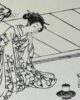 Estampe japonaise ōban tate-e e-hon par Kiyotada (actif fin du XIXème siècle) représentant une jeune femme agenouillée à l’intérieur d’un pavillon ouvert sur un jardin.