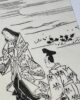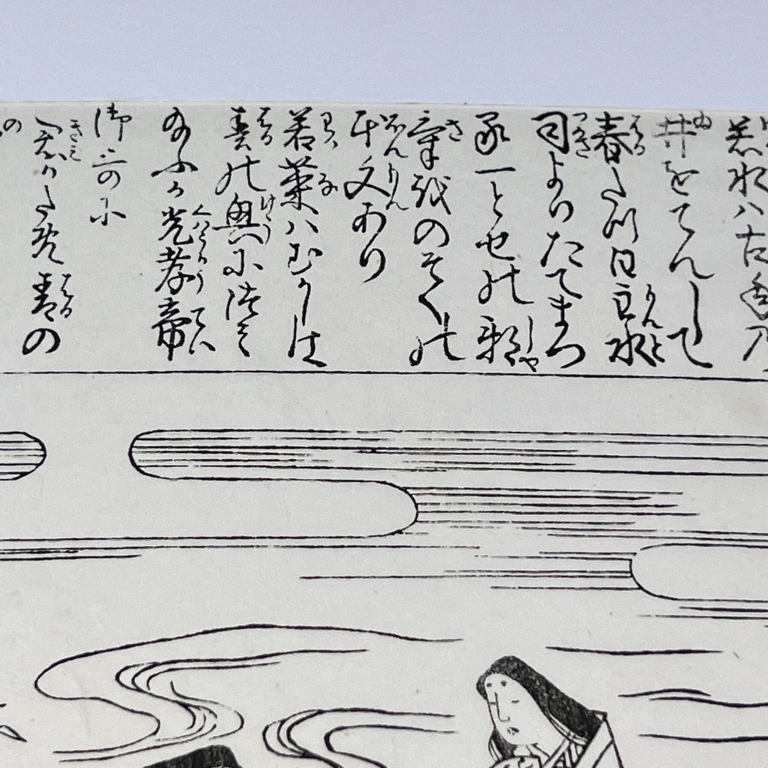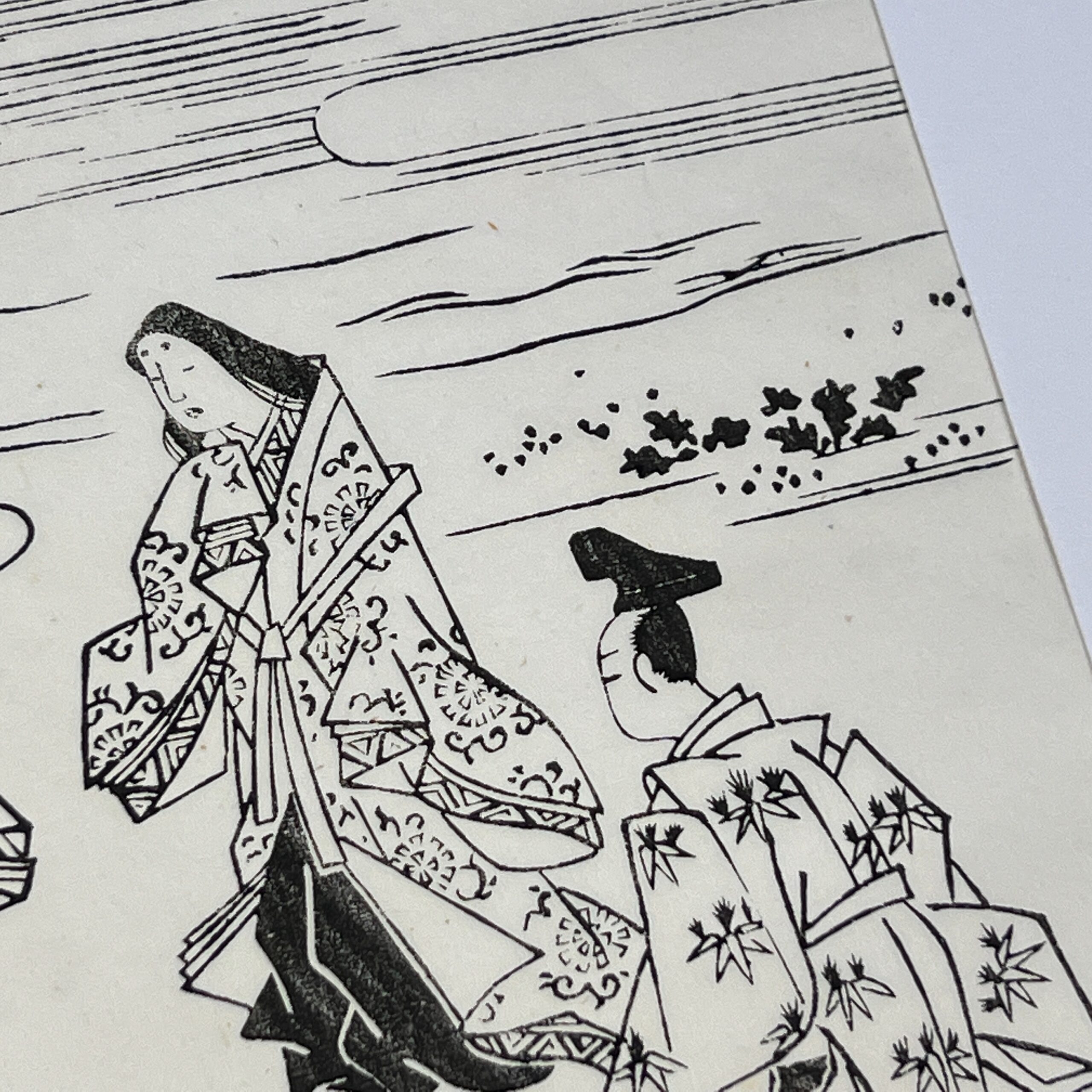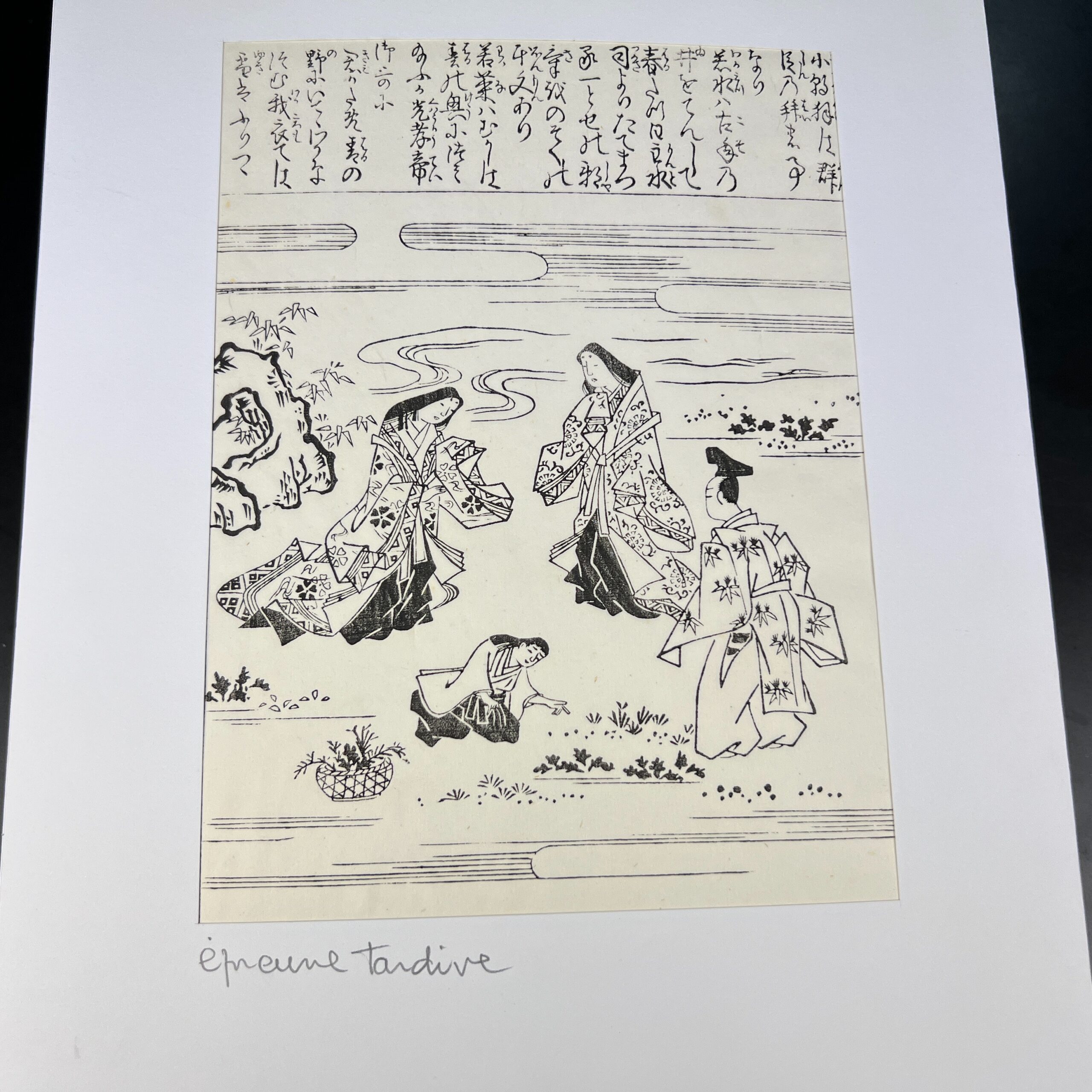 L’ensemble évoque un moment suspendu, empreint de retenue et de poésie, typique de l’imaginaire aristocratique japonais. Scène confirmée par le poème écrit en cursif qu’il est possible de traduire comme suit :