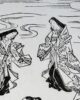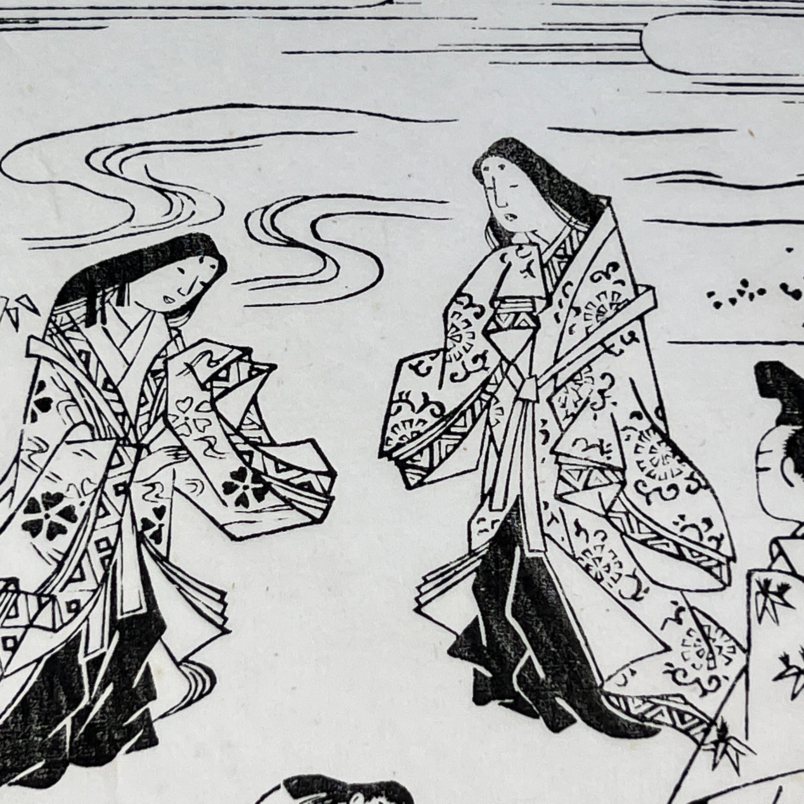 Trois femmes (dans le style du « Dit du Genji ») richement vêtues de kimonos à motifs floraux se tiennent debout, engagées dans une conversation, tandis qu’une quatrième figure, plus jeune ou de rang inférieur, est agenouillée et semble cueillir ou observer des plantes au sol.