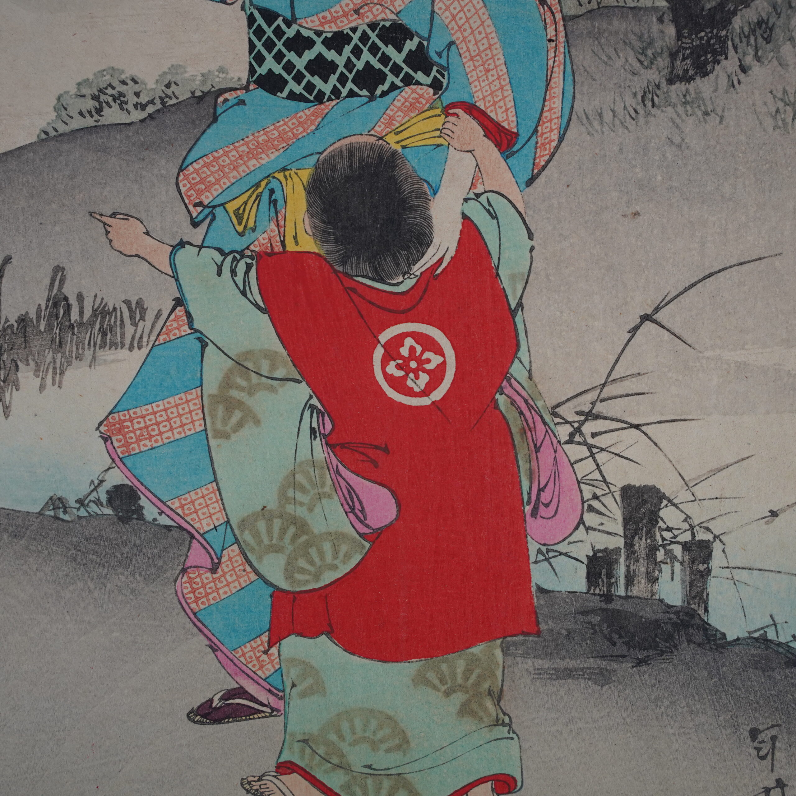 Une estampe qui montre le savoir-faire de Toshikata aussi bien dans le détail des tissus que dans la légèreté des paysages du Japon.