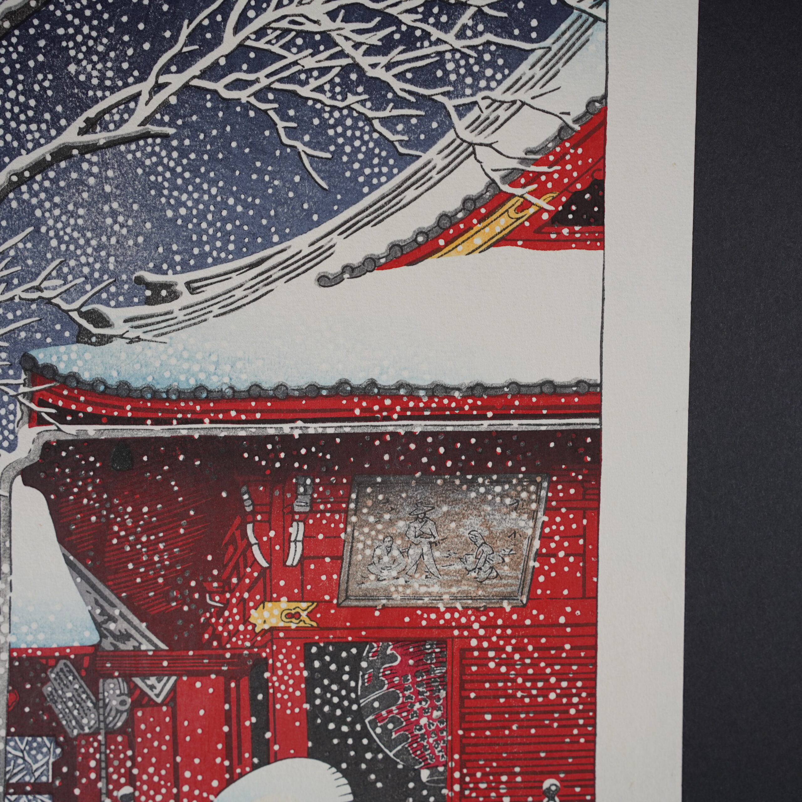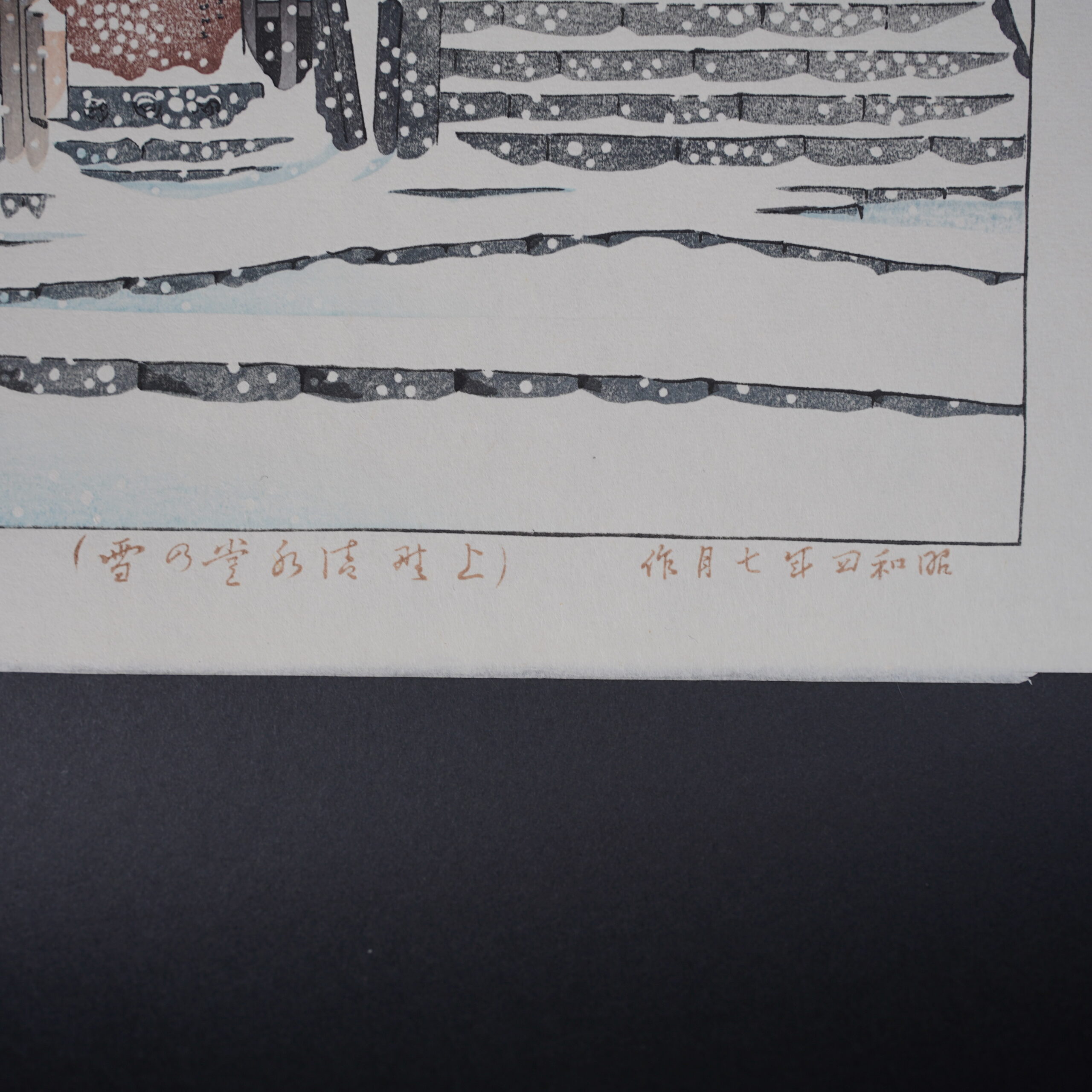 Estampe intitulée la Neige à Ueno, Temple Kiyomizudo par Kawase Hasui (1883-1957).