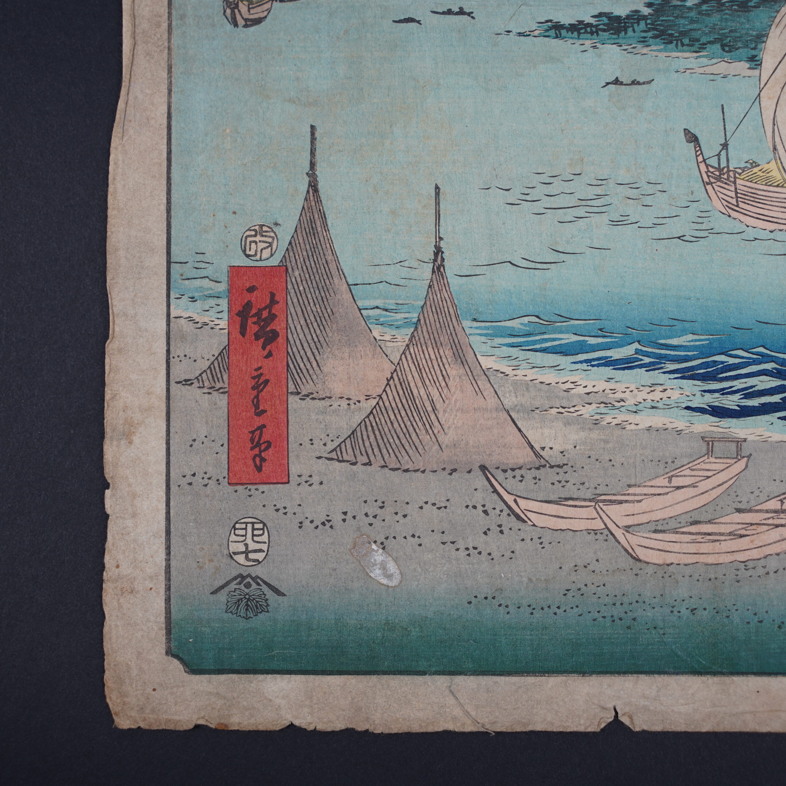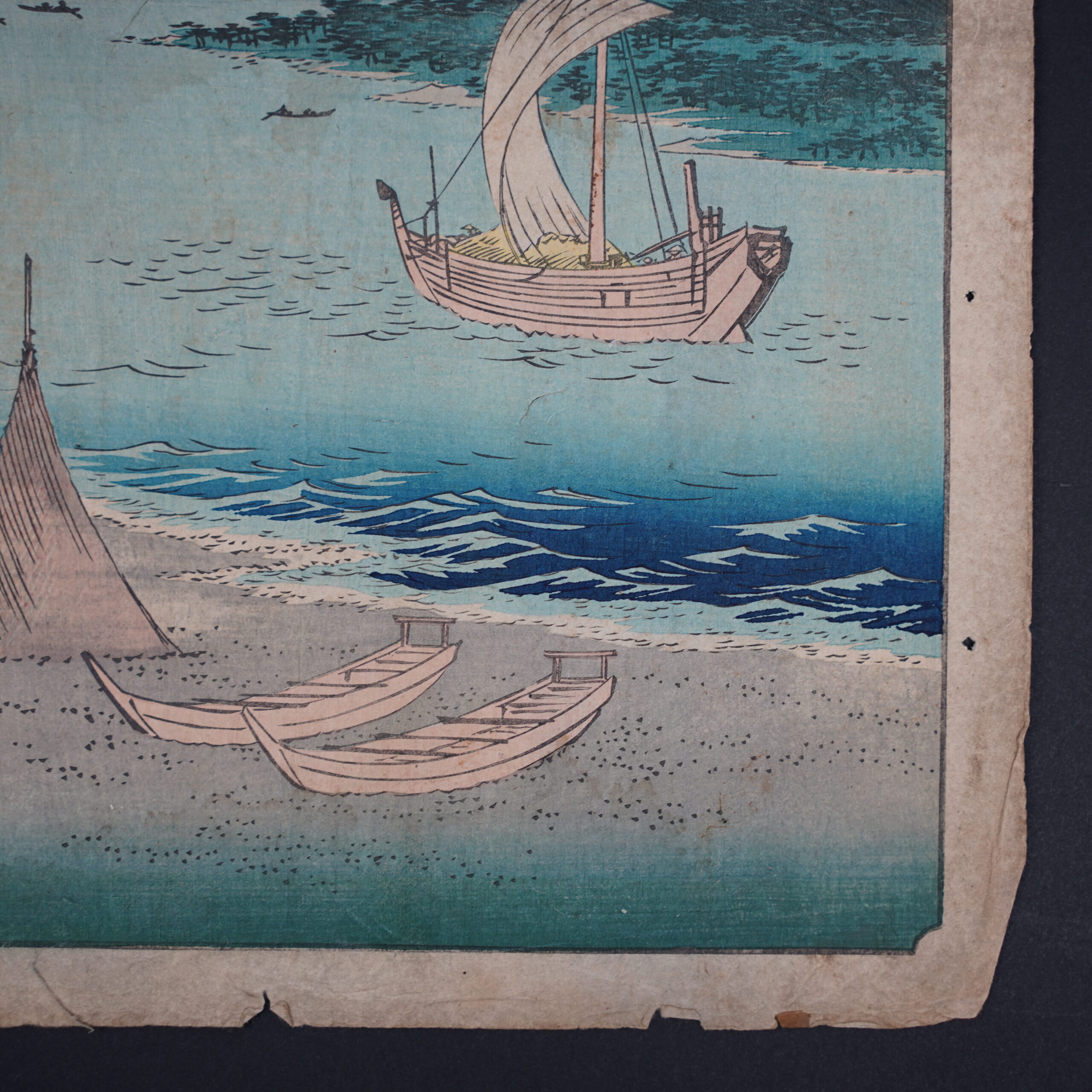 Des barques, voiles blanches et tentes de pêcheurs animent la plage, tandis que les dégradés de bleu et de vert créent une atmosphère calme et lumineuse typique du style tardif d’Hiroshige.
