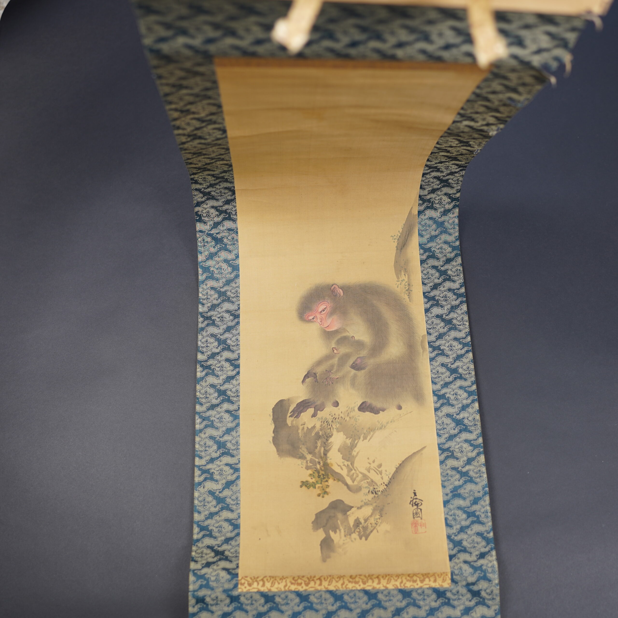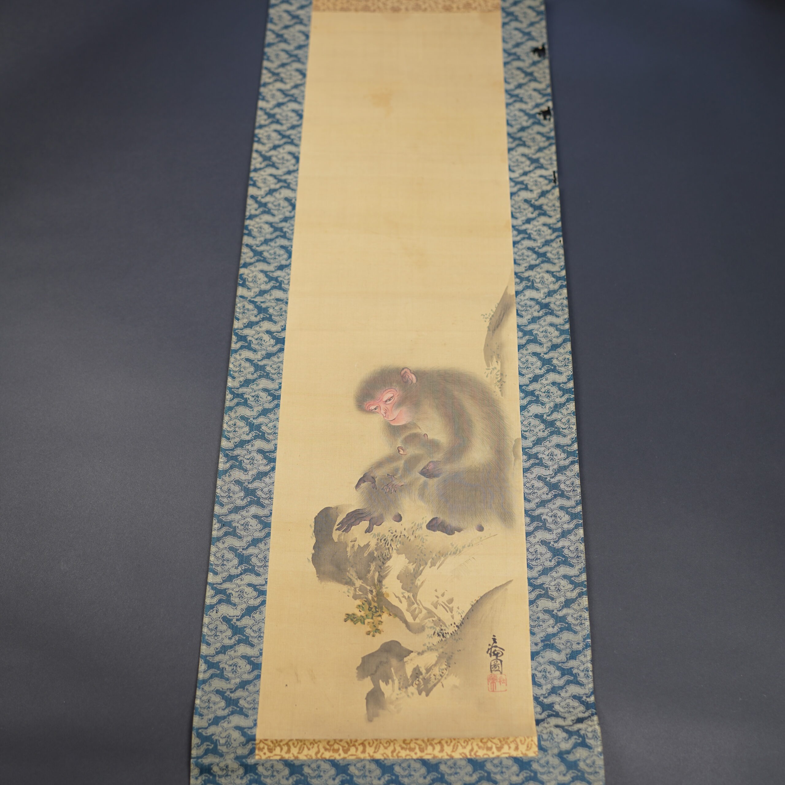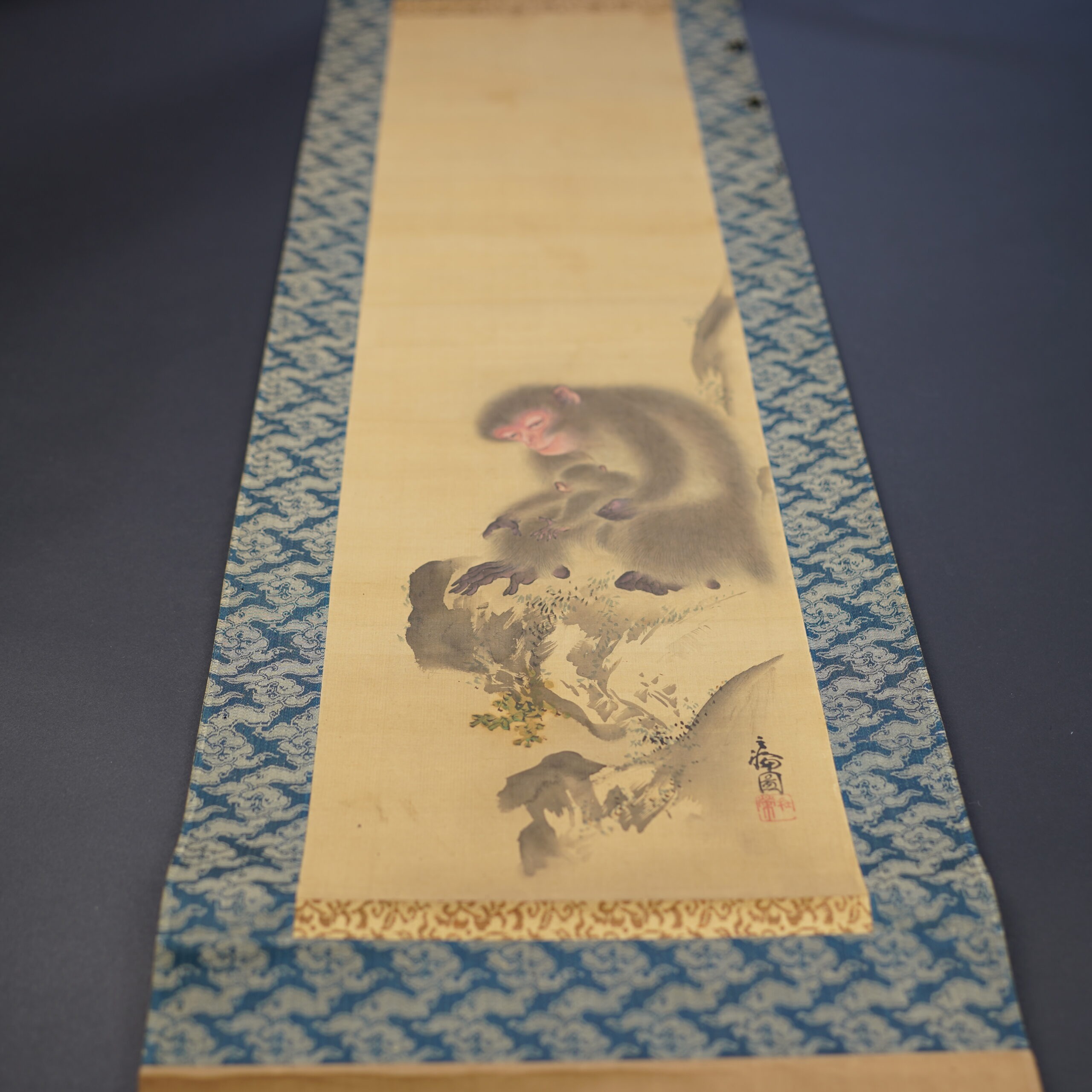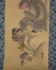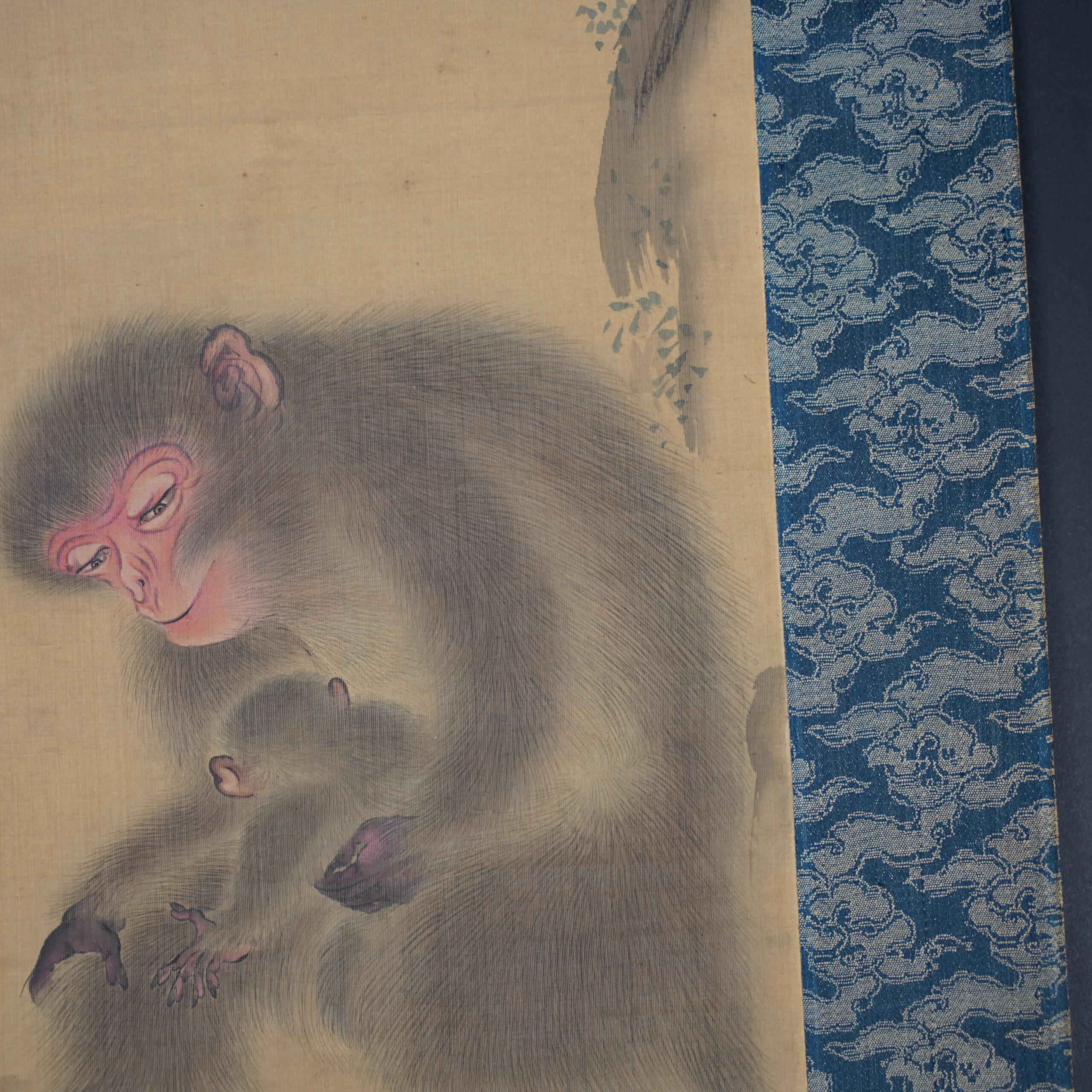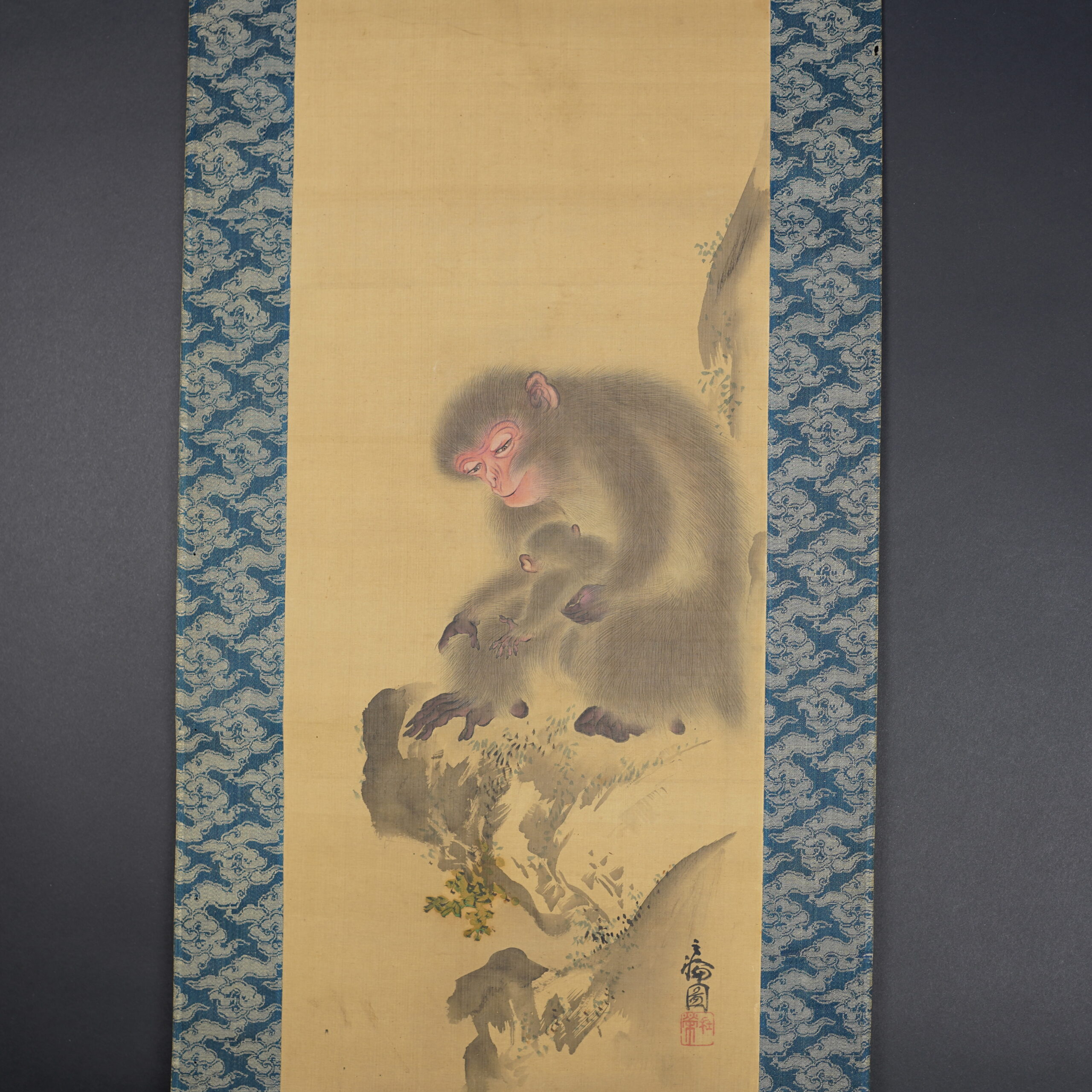 Kakejiku (kakemono), peinture à l’encre représentant un singe macaque et son petit par Baien.