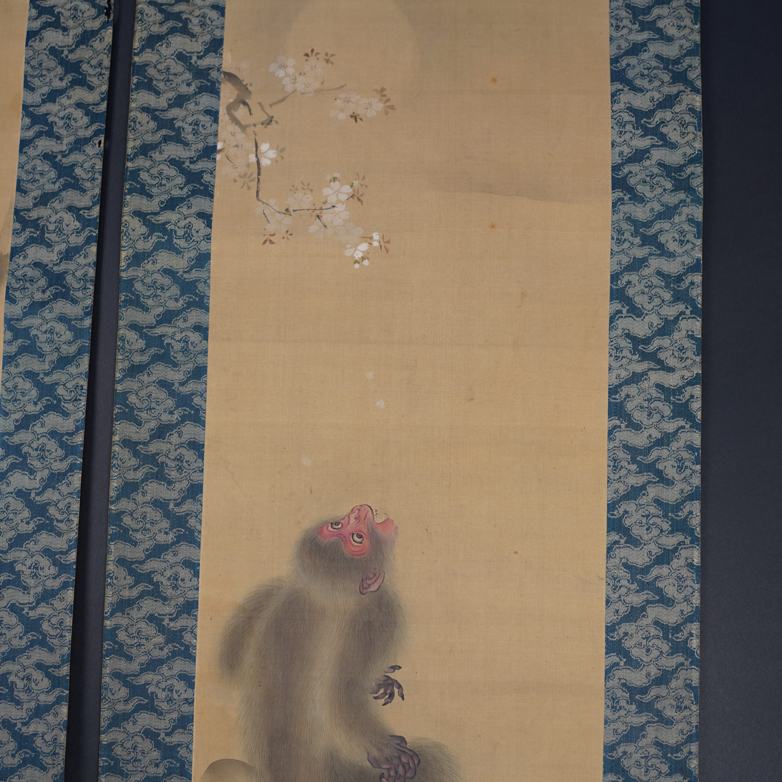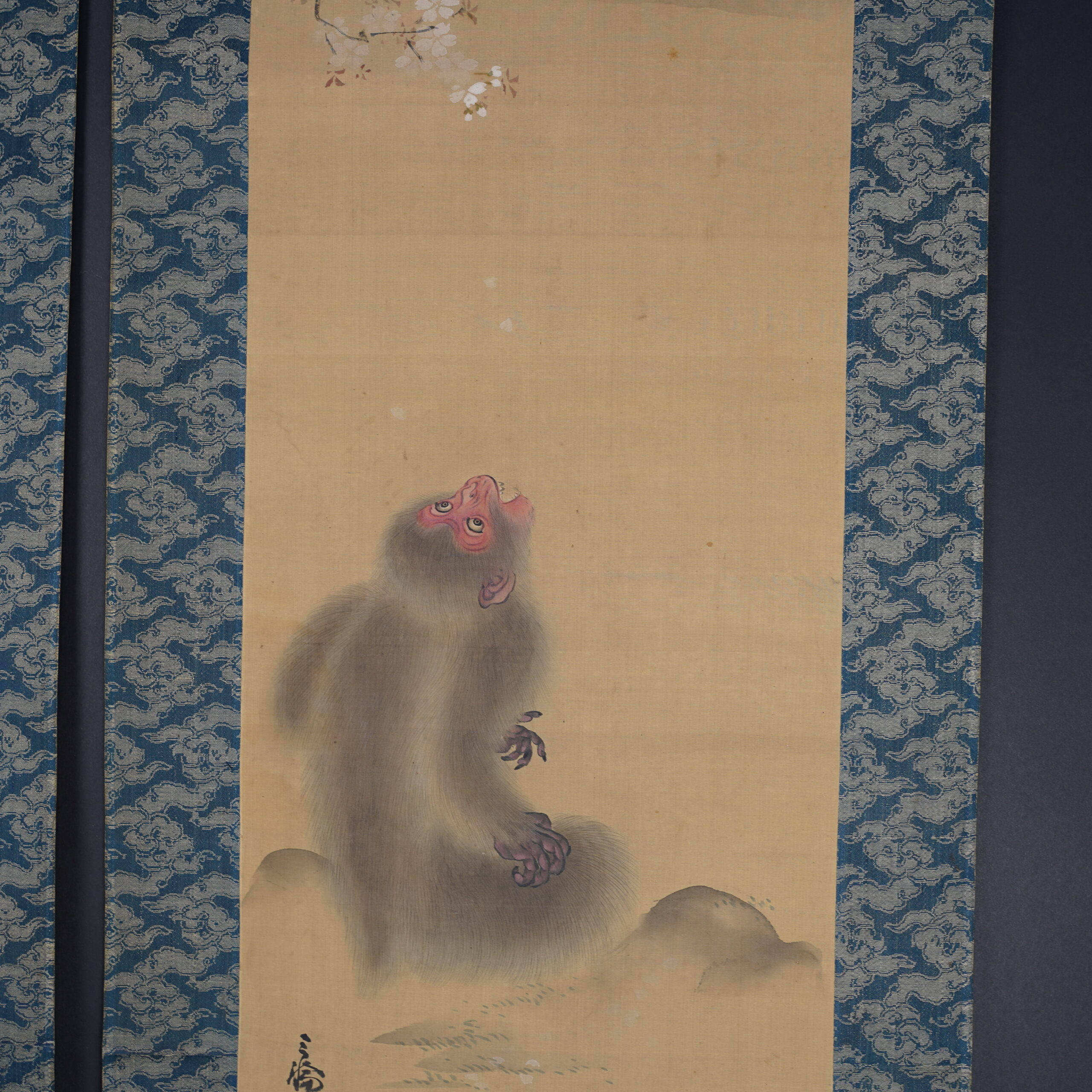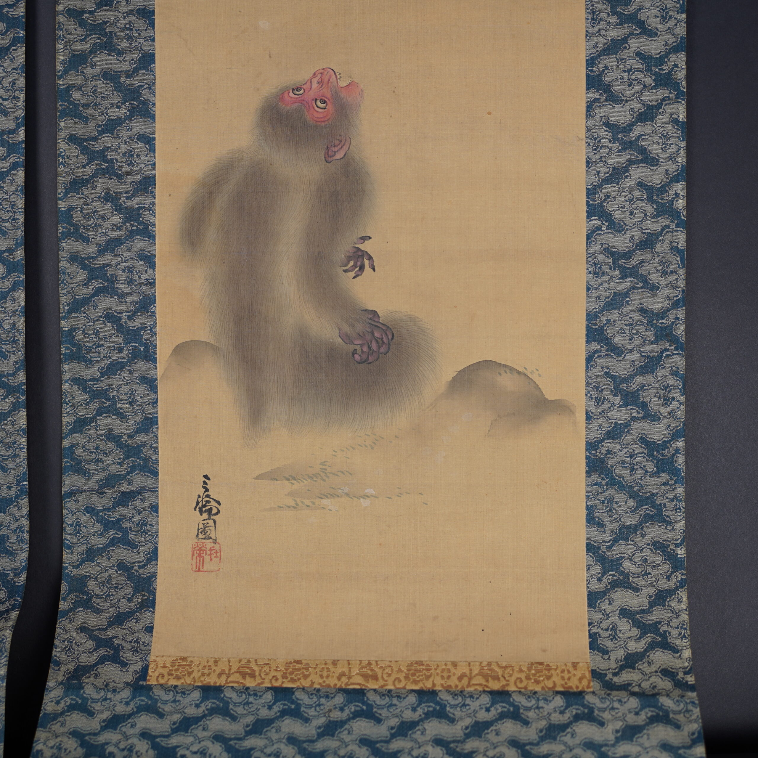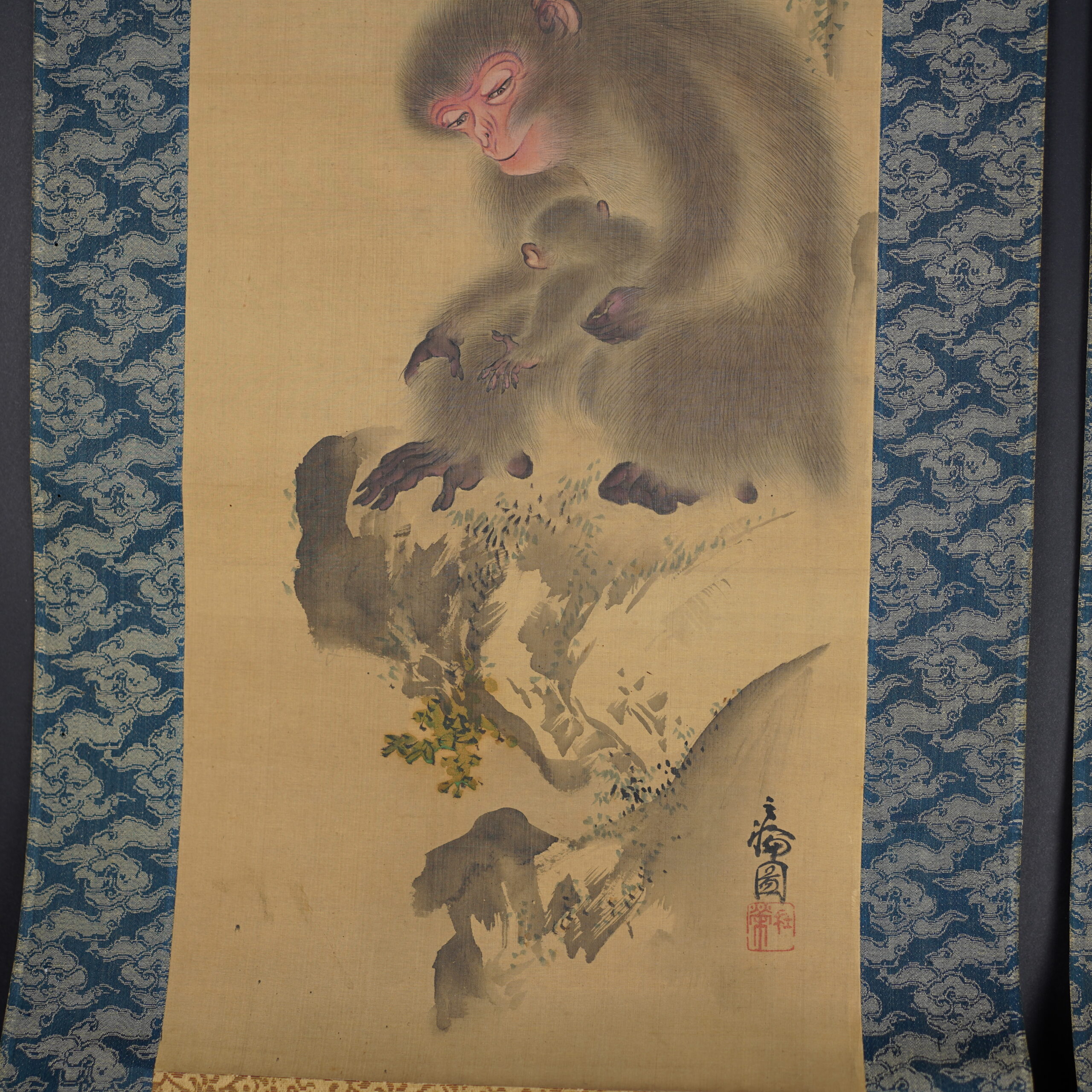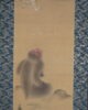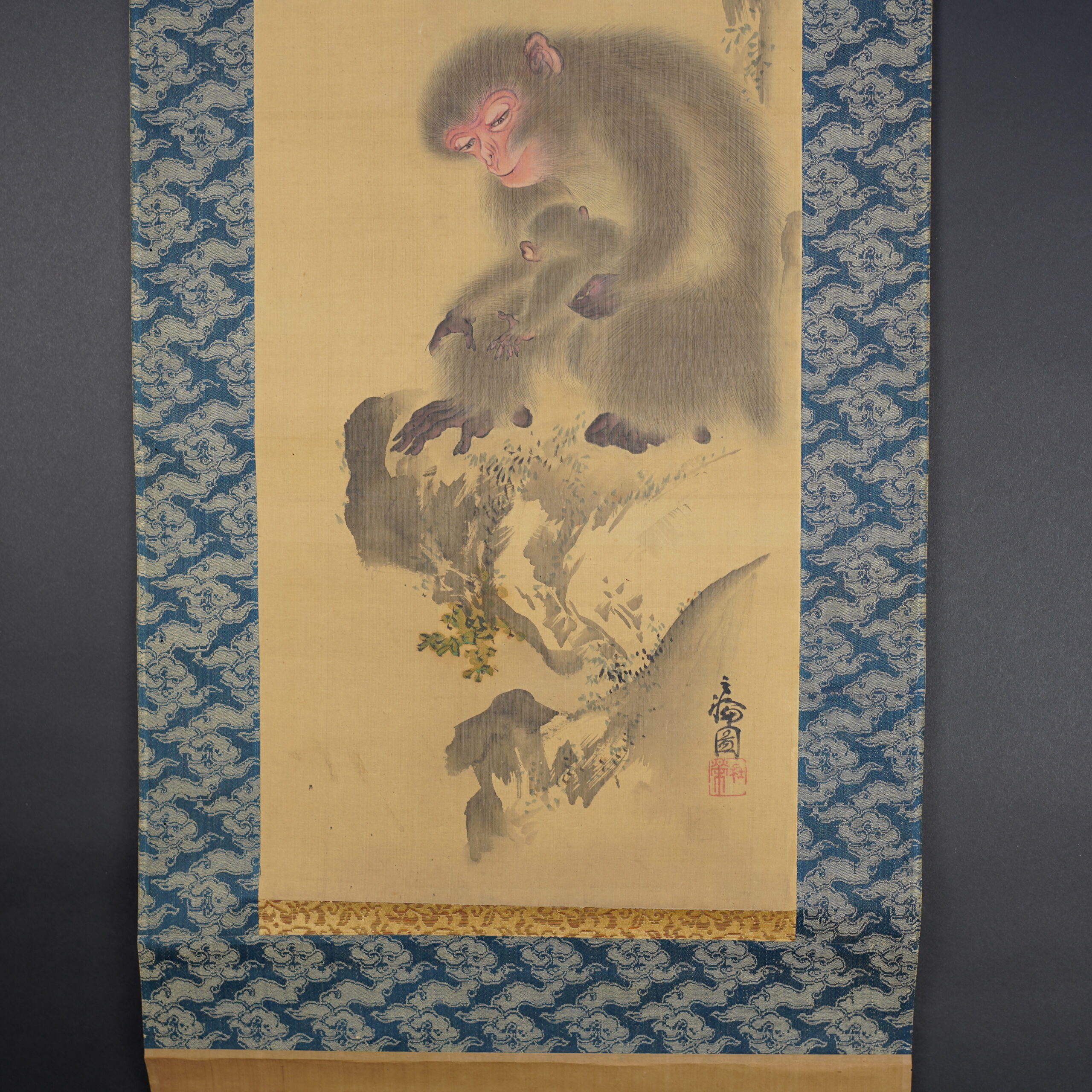 Kakejiku (kakemono), peinture à l’encre représentant un singe macaque et son petit par Baien.