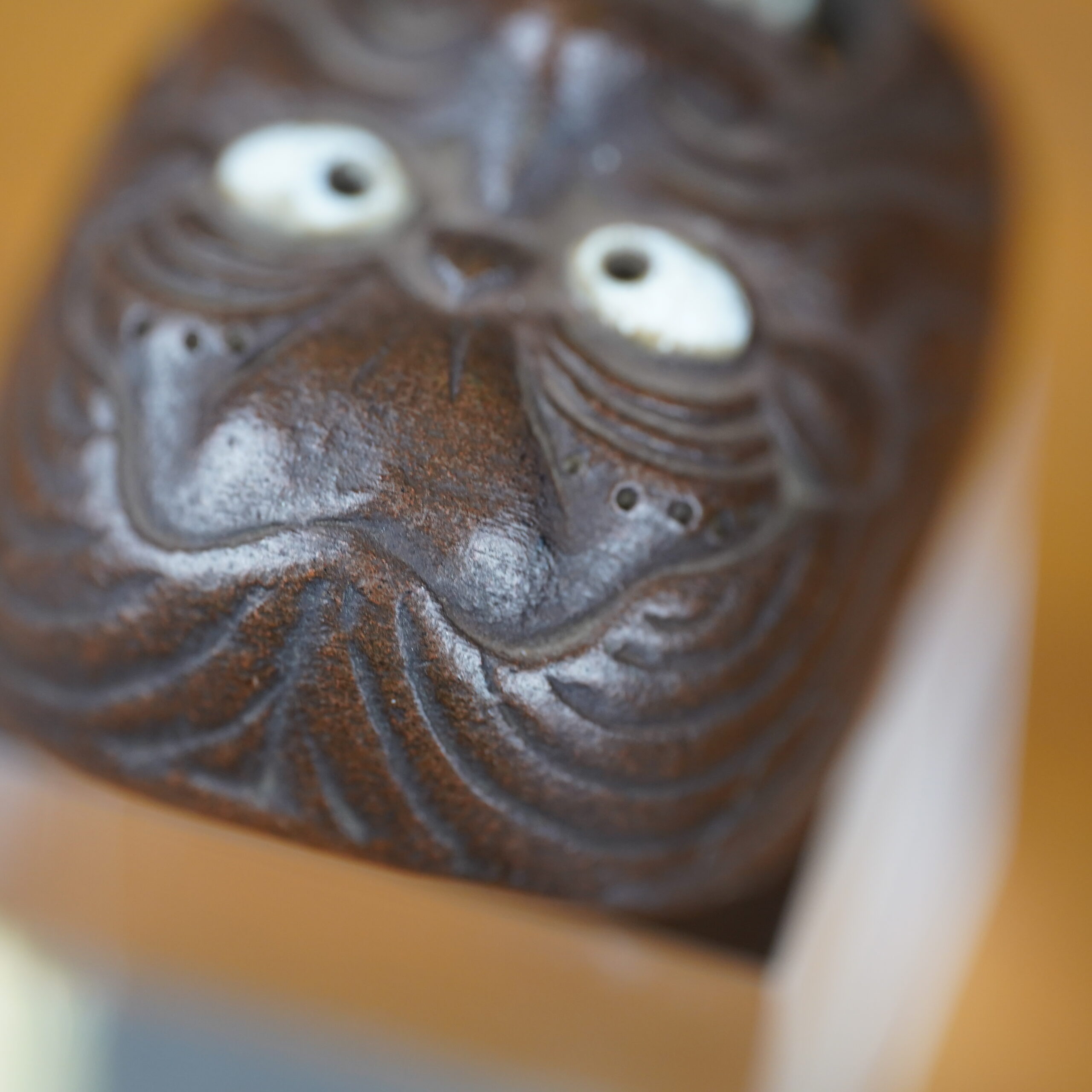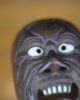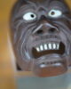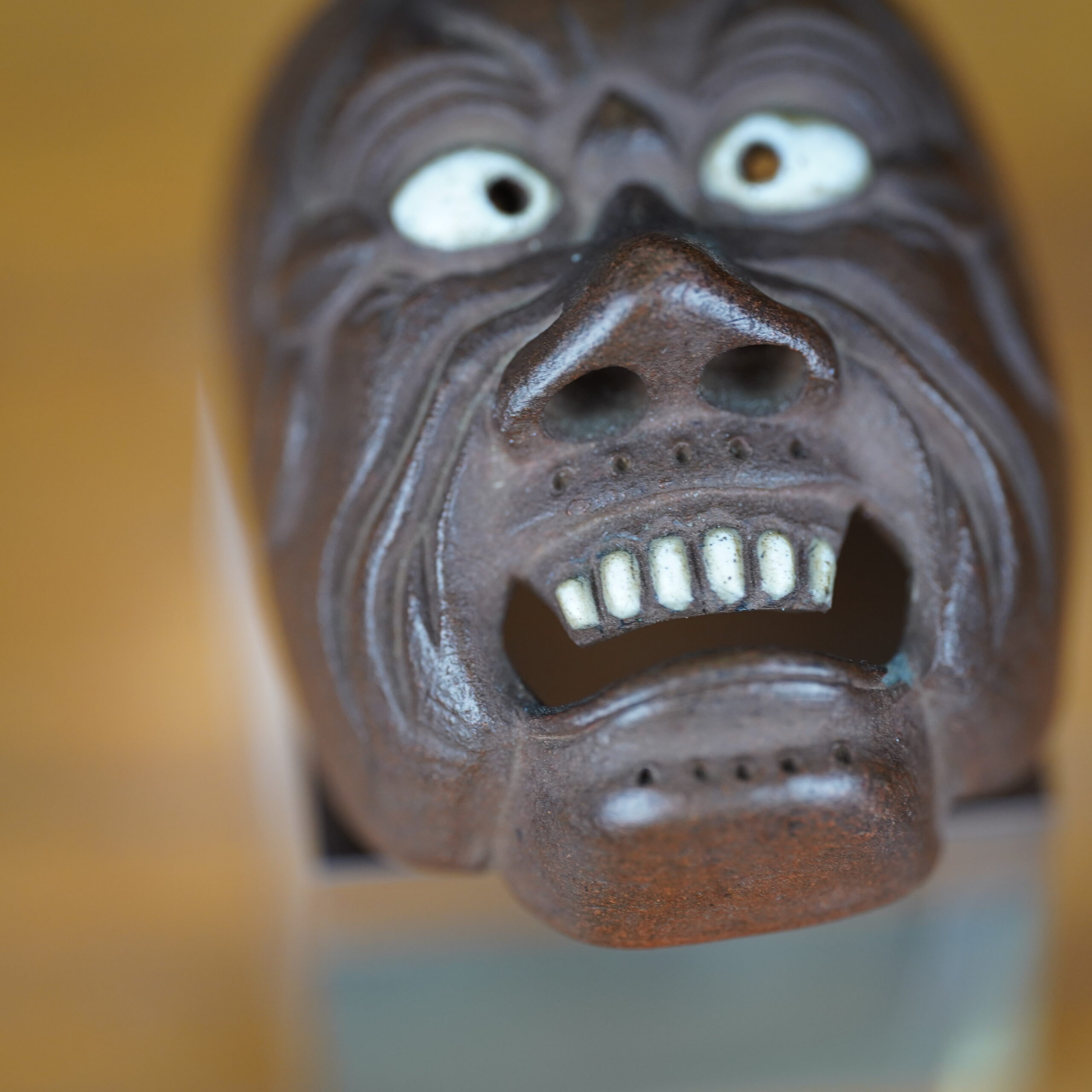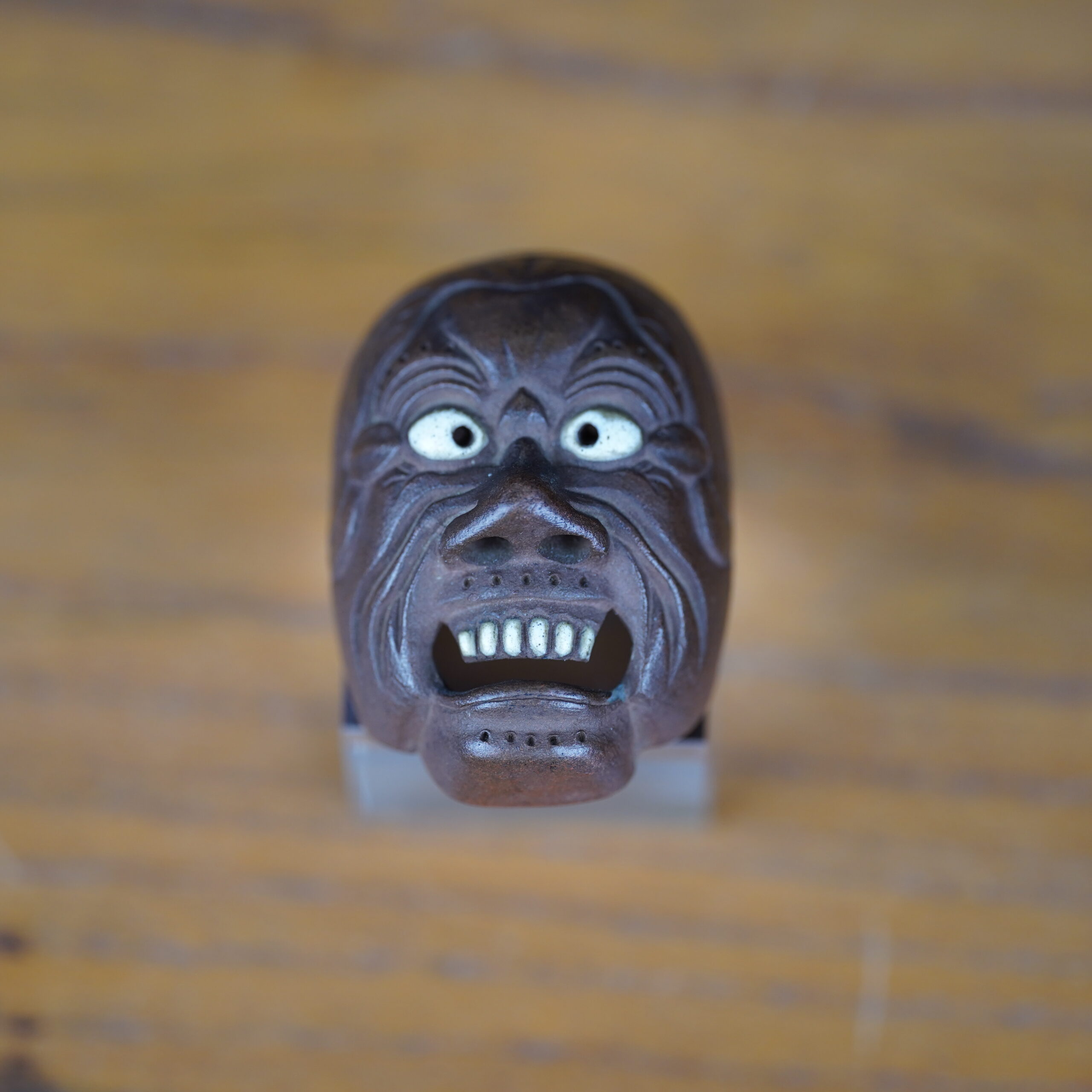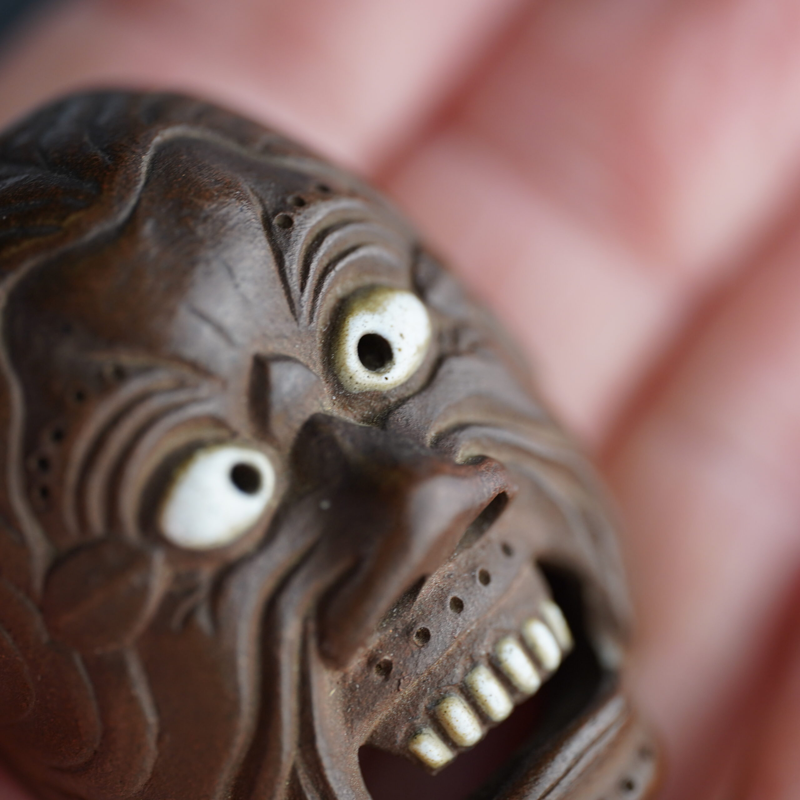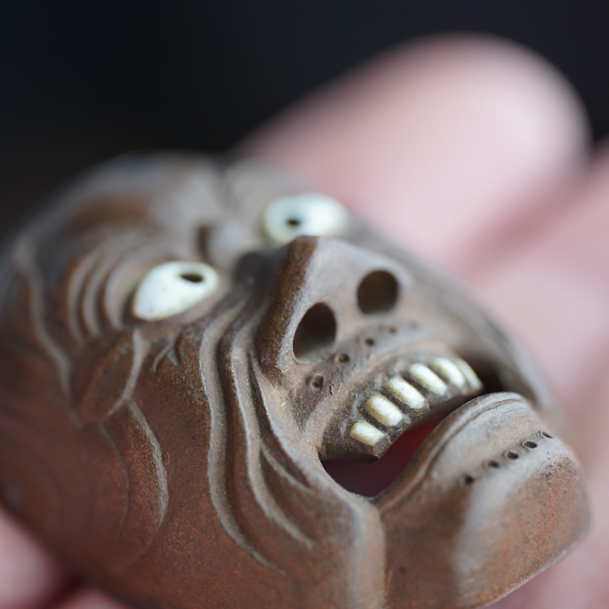 Netsuke en céramique de type onko-yaki représentant un masque de démon (oni) aux yeux blancs, dents émaillées blanches.