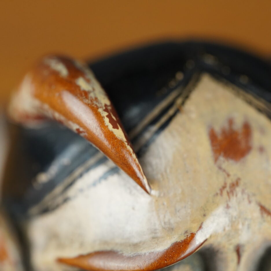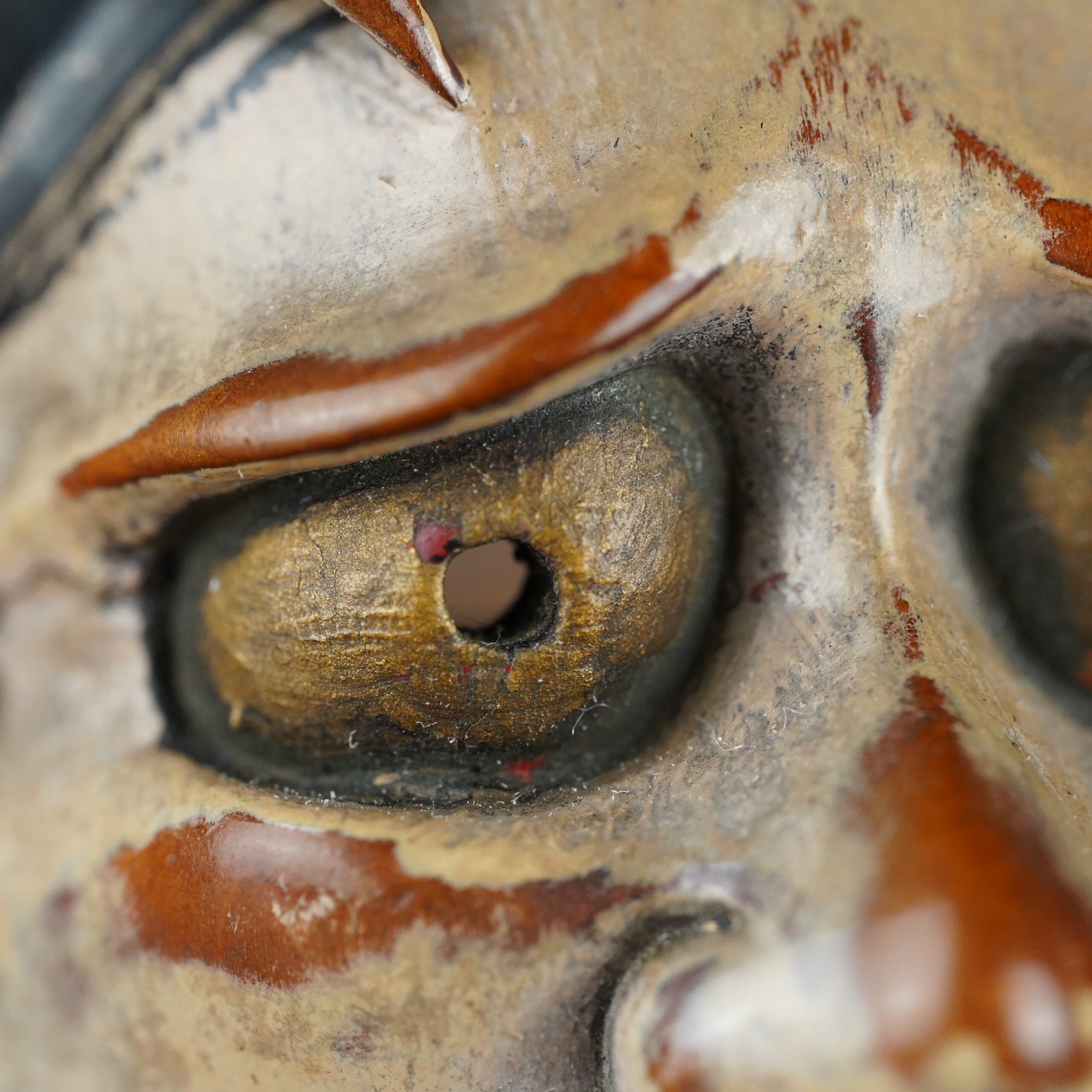 Notez l’usure des couches de laque comme si le masque avait été porté.