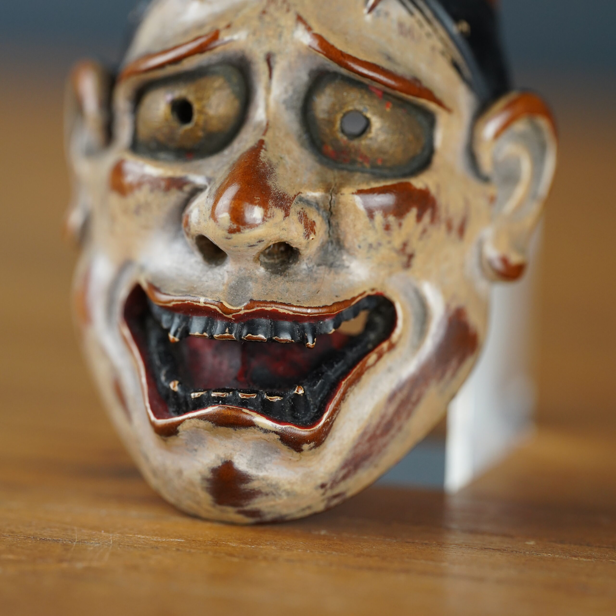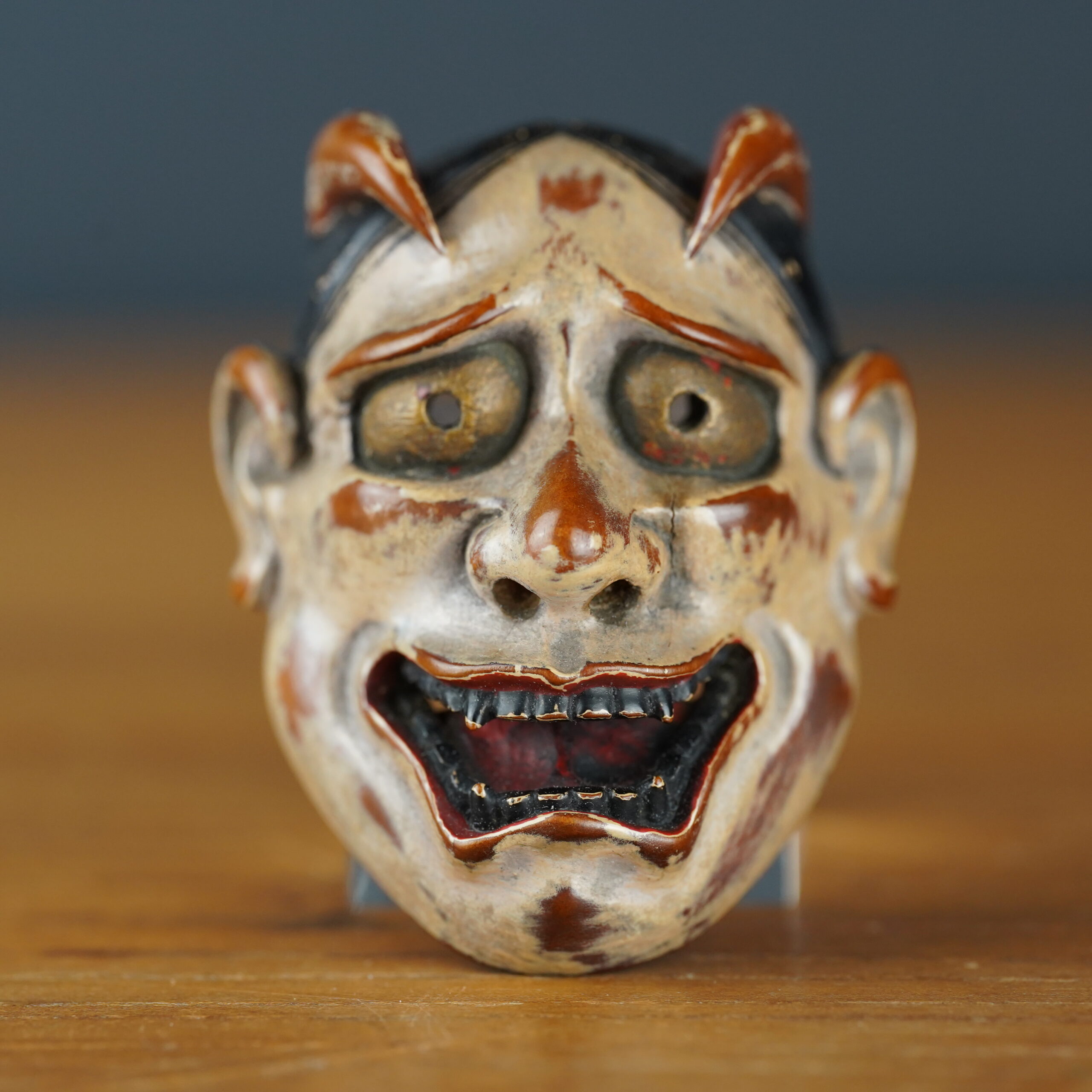 Netsuke en bois laqué représentant un masque de femme démon (kijo) hannya dans l’esprit des masques de théâtre nō.