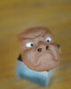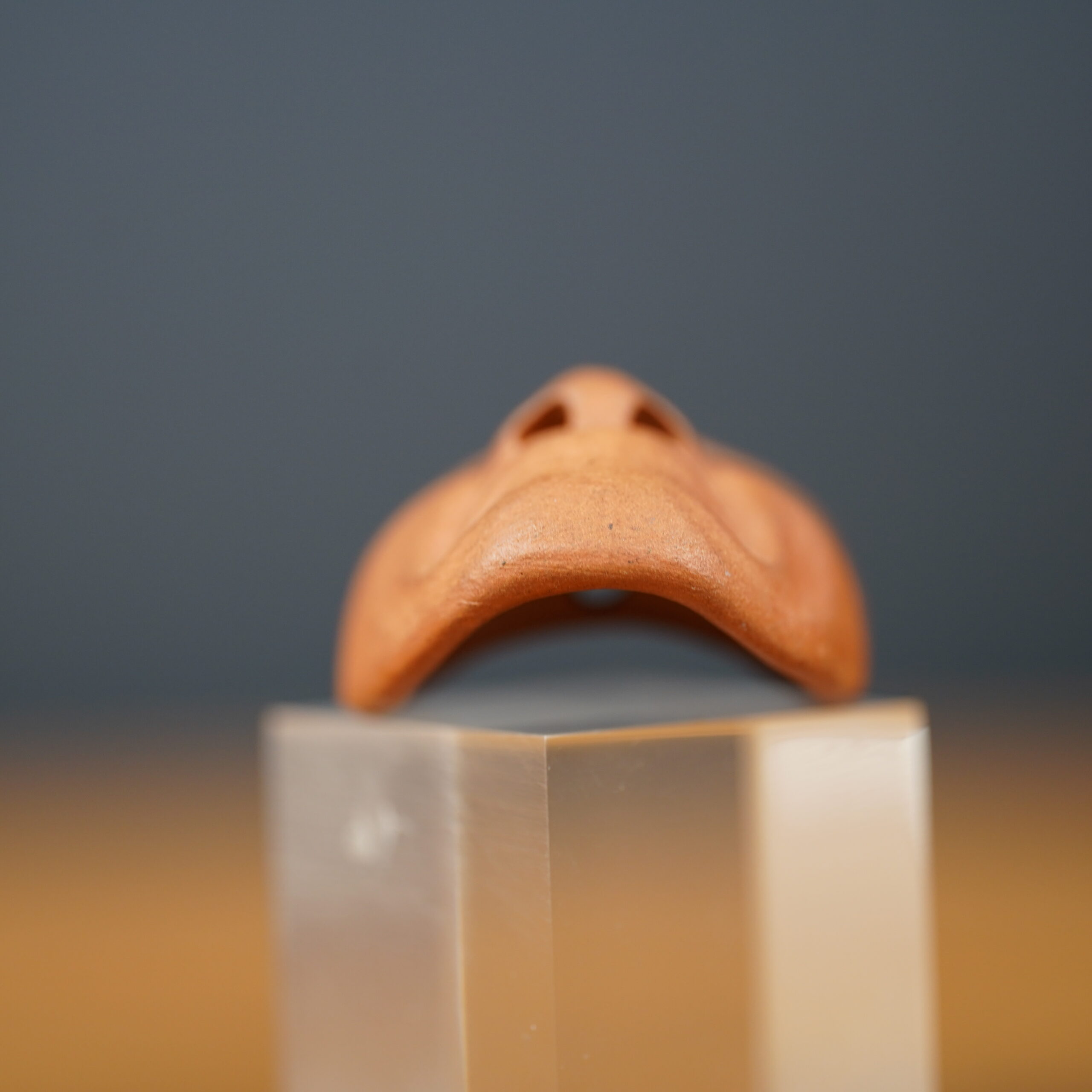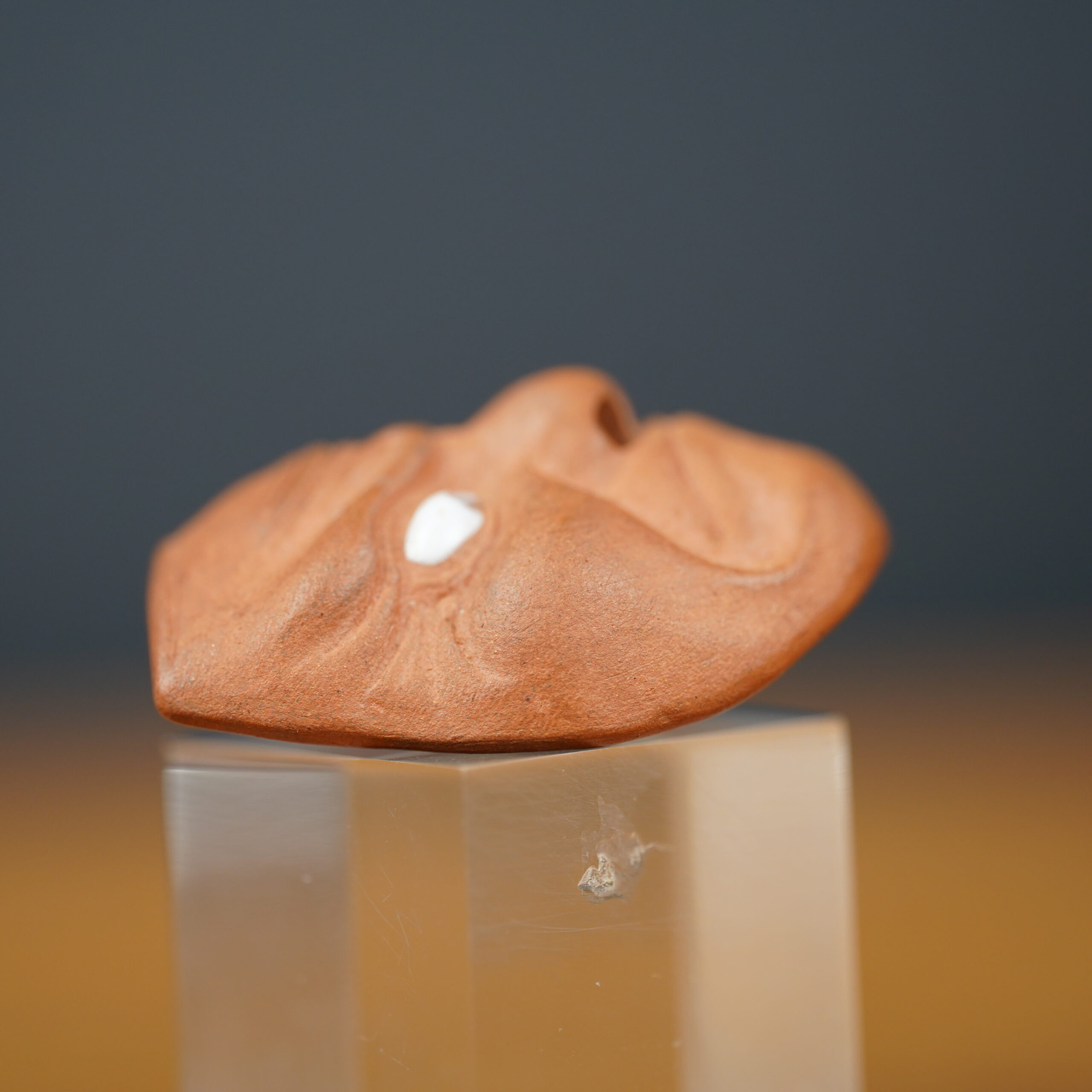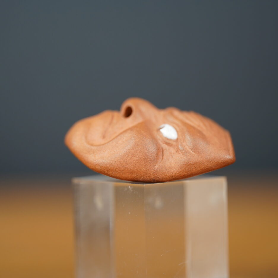 Netsuke représentant un masque de théâtre Beshimi grimaçant en céramique de type onko-yaki aux yeux émaillés blanc.