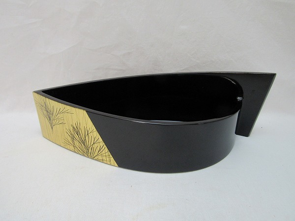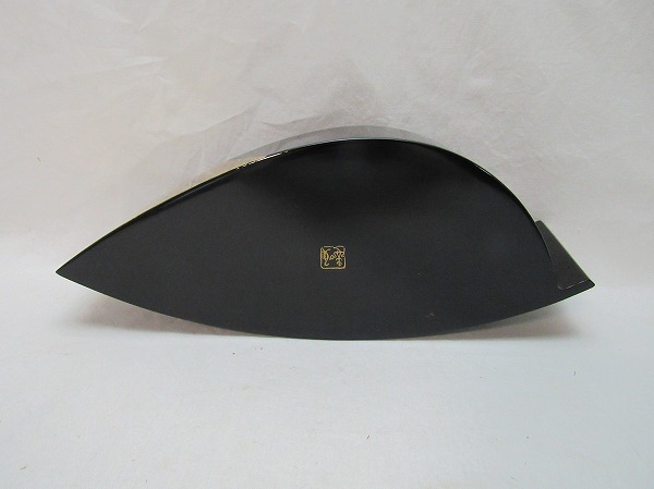 Plat ou vase d’ikebana en bois laqué noir wajima-nuri en forme de feuille à décor de feuilles en négatif or.