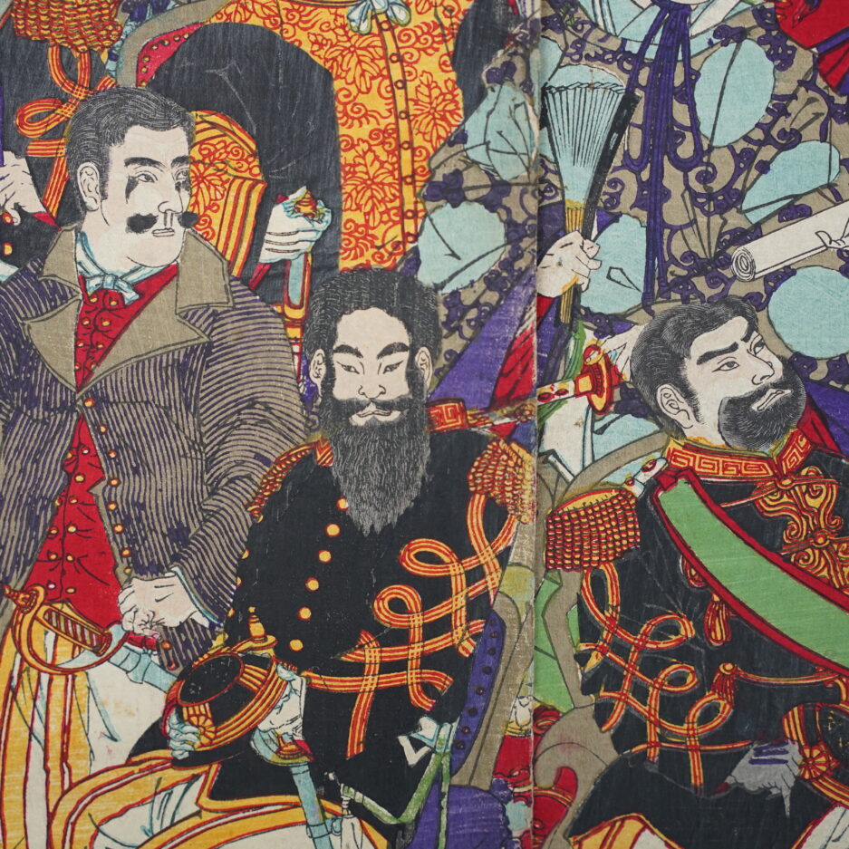 Triptyque d’estampes japonaises ukiyo-e signées Toyohara Kunichika (1835-1900) représentant des les membres de la Cour de l’Empereur Meiji.