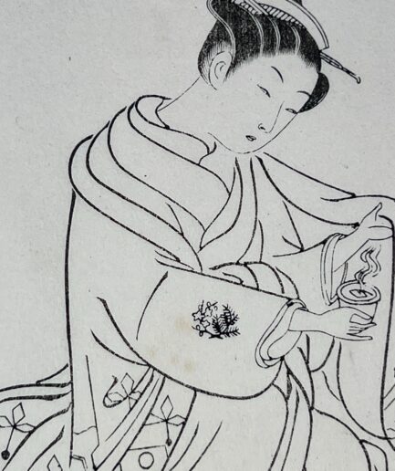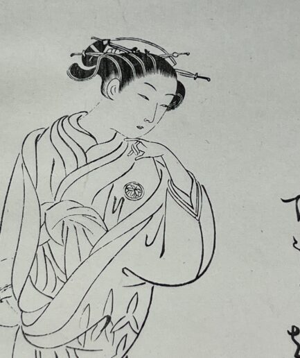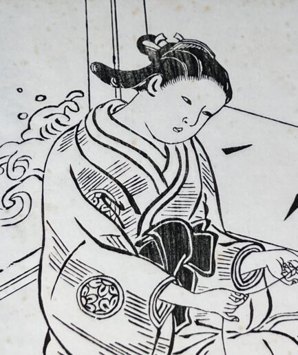 Estampe japonaise e-Hon représentant un femme en kimono et petit singe par Harunobu – Meiji XIXe s.